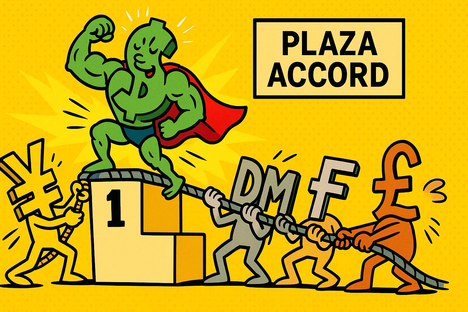 En septiembre de 1985, los países más poderosos del planeta (EE.UU., Japón, Alemania, Francia y Reino Unido) se reunieron en el hotel “Plaza Accord” de Nueva York y dijeron: “ok, dólar, bájate del podio”. El billete verde estaba tan fuerte que estaba aplastando industrias, generando déficit comercial y provocando ira entre exportadores. La solución: coordinar esfuerzos para depreciarlo.